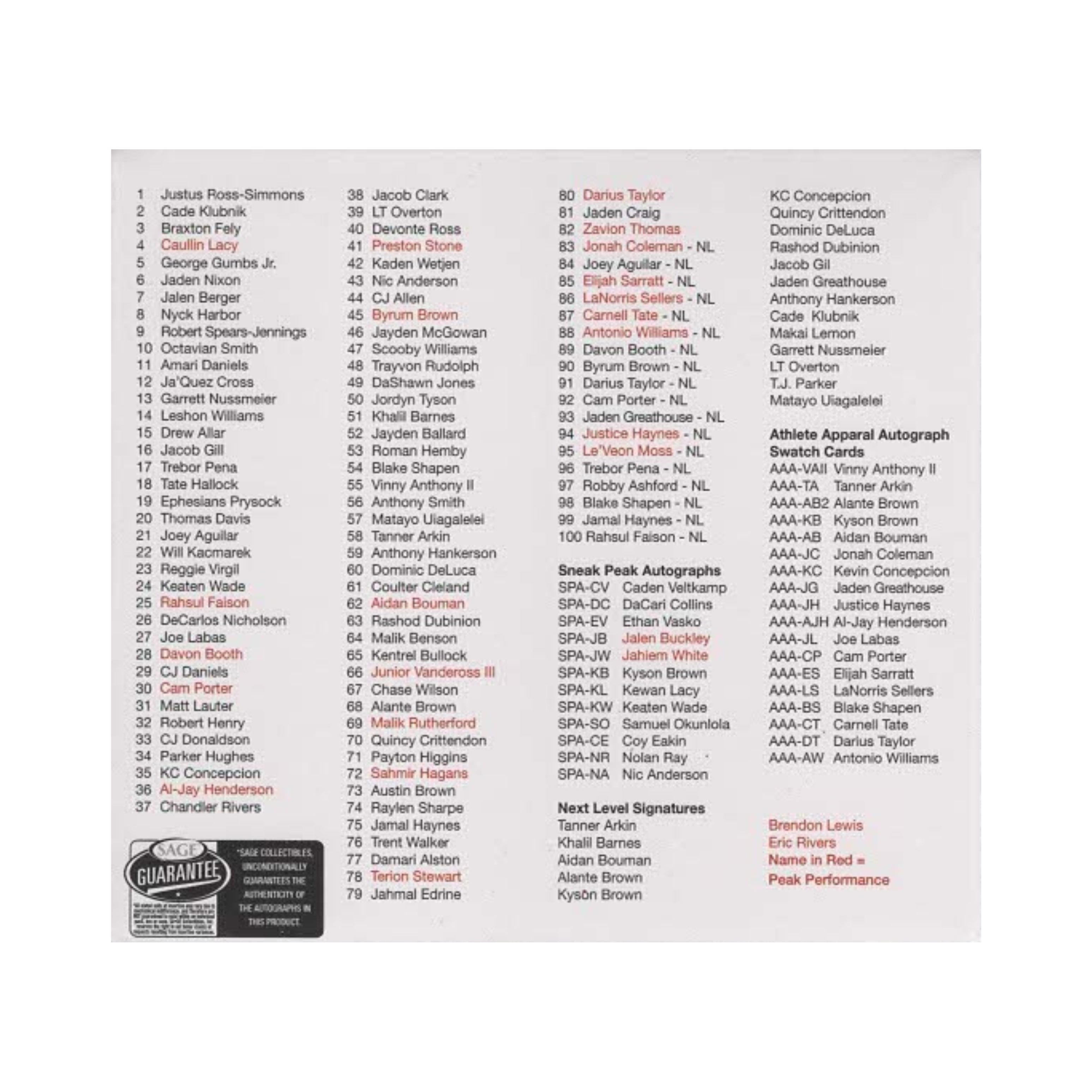Find Next Level Signatures featuring On-Card Autographs and foiled parallels, Peak Performance "Chrome-style" base, parallel and autograph cards with multiple patterns and raised UV coating, and Sneak Peek autographs featuring future Draft top prospects.