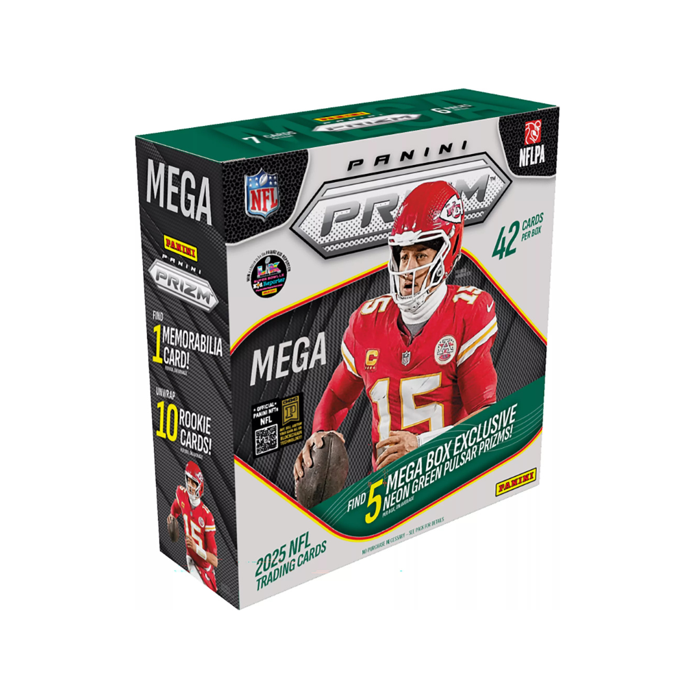 Find (1) Memorabilia Card and (5) Mega Box Exclusive, Neon Green Pulsar Prizms, (3) base or Rookie Prizms, and (2) Inserts per box on average!